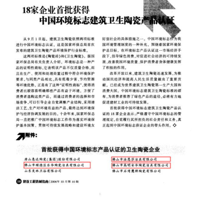 *2006年,,,,,,18家企业首批获得中国情形标记修建卫生陶瓷产品认证,,,,,,其中stake官网家居集团包办3个名额
