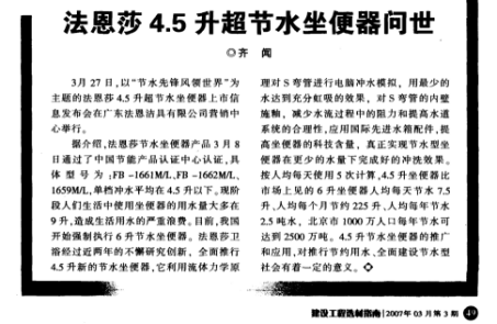 *2007年,,,,,,法恩莎4.5升超节水座便器问世,,,,,,远远达超国家节水产品6升的标准